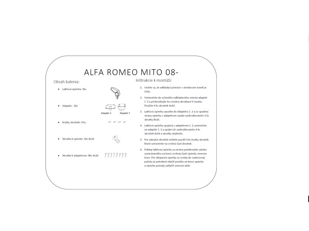 Lakťová opierka vyrobená pre Alfa Romeo MiTo rok výroby od 2008 do 2018.