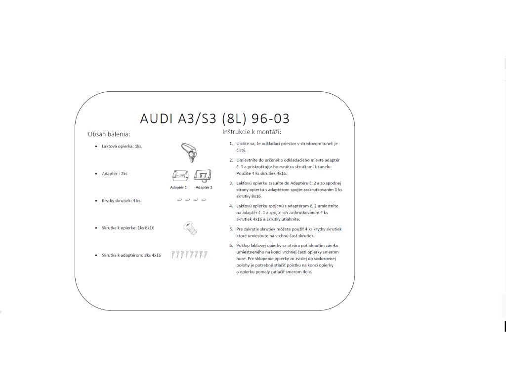 Lakťová opierka vyrobená pre AUDI A3 (aj S3) model 8L vyrábaný v rokoch 1996 - 2003.