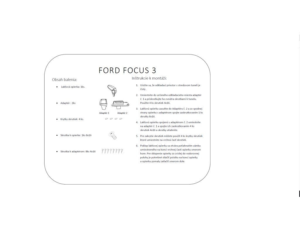 Lakťová opierka vyrobená Ford Focus III generácie model MK3 rok výroby od 2011 do 2018.