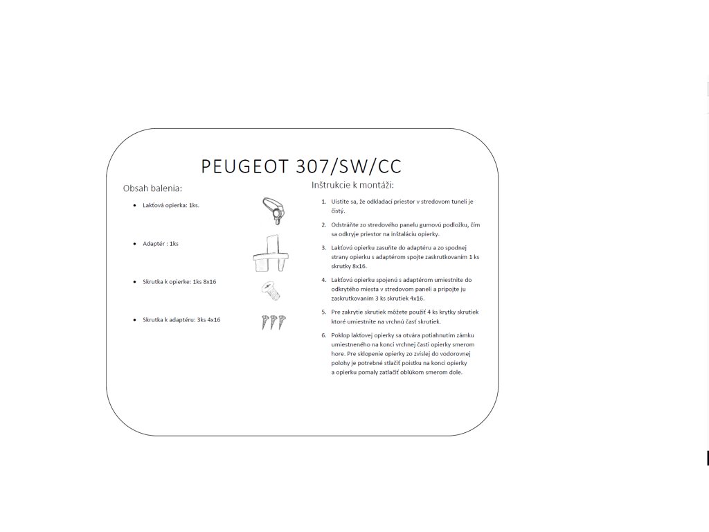 Lakťová opierka vyrobená pre PEUGEOT 307 aj Break, SW, rok výroby 2001 až 2011.