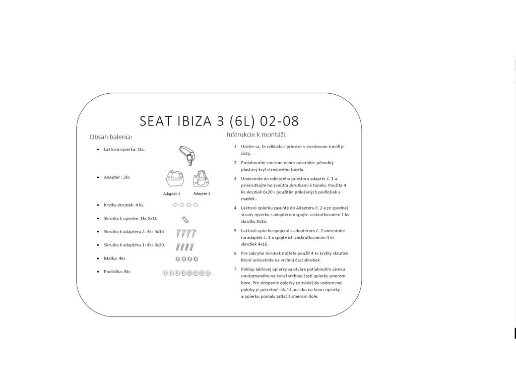 Lakťová opierka vyrobená pre Seat IBIZA 3. generácia model 6L vyrábaný v rokoch 2002 - 2008.